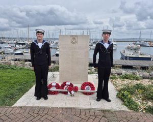 Able Cadets Daniel and Lewis took part in the HMS Illustrious Memorial Service held at the Commemoration Stone in Portland Marina. Lewis did a reading during the Service and Daniel piped ‘The Still’ and ‘Carry On’ to mark the period of silence. They were both a credit to the Sea Cadets and looked very smart.